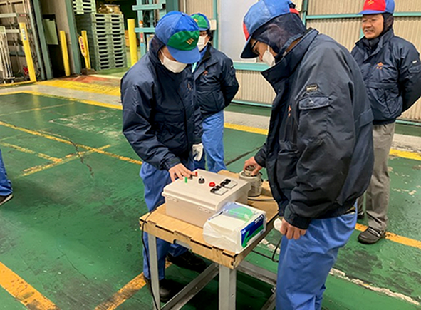 社員が災害の怖さを身をもって知り、災害の原因となる危険箇所の抽出、機械設備への対策を自ら進んで実施できるようにするため、危険体感機を導入し、新入社員の研修時には必ず講習を実施します。また、お客様の工場へ「安全交流会」として出張する機会もあります。