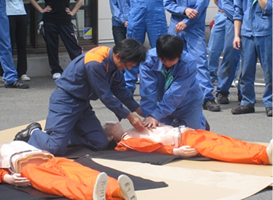 また、社員自らが適切な応急手当ができるよう救命講習会も定期的に実施しています。人形を用いたAED(自動対外式除細動器)の操作や、二人一組での救命方法を学び、緊急時には自分を守り、仲間を守れる訓練を実施しております。