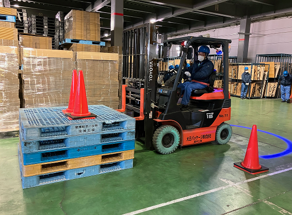 フォークリフトによる災害を防ぐため、定期的に専門業者を招き、フォークリフト安全講習会を実施します。安全の基礎知識や実車講習、日々の点検項目を再確認します。